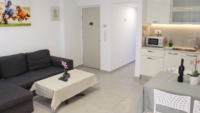 דירת נופש להשכרה יומית באילת – דירת 1 חדר שינה וסלון מדהימה במרכז העיר אילת. הדירה משופצת ברמה גבוהה ,6 דקות הליכה לים והטיילת ממוקמת במרכז העיר וקרובה להכל, סופרמקרט גדול ואיכותי בכניסה למתחם. בדירה: מטבח כולל מקרר, מיקרוגל כיריים (חשמליות), טוסטר וכל כלי המטבח + פינת אוכל. אינטרנט אלחוטי חינם וכבלים כל הערוצים. בסלון ספה נפתחת למיטה זוגית + שולחן בסלון. חדר שינה עם מיטה זוגית, ארון ושידה. יש אפשרות להוסיף לול מתקפל במקרה הצורך. במרפסת: שולחן עם כיסאות. הדירה מתאימה גם למעשנים באיזורים המותרים (מרפסת הדירה).