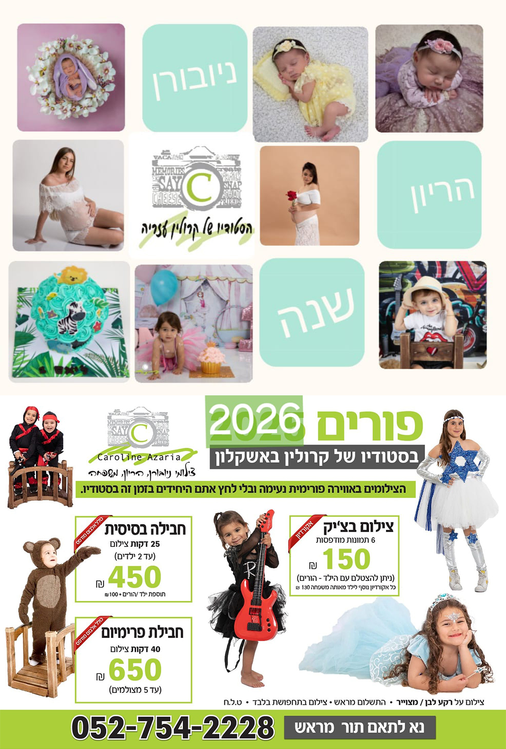 סטודיו בוטיק המתמחה בצילום ניו-בורן, הריון וילדים הנמצא באשקלון.הסטודיו מאובזר במגוון אביזרים ואקססוריז שנבחרו בקפידה ומותאמים לצילומים אלו. מבטיחה לכם סשן צילומים מלא בסבלנות, בטיחות, מקצועיות ואהבה.