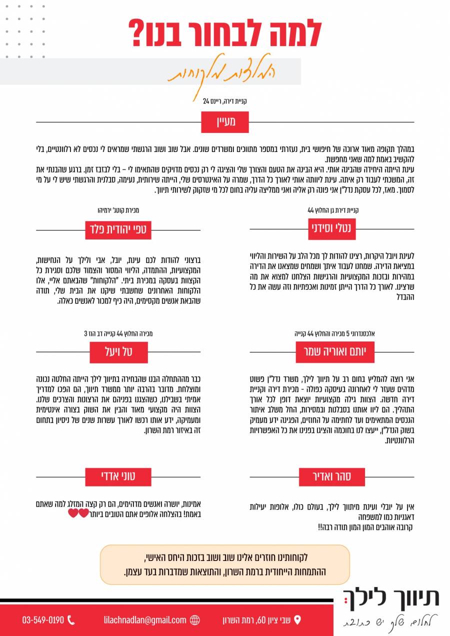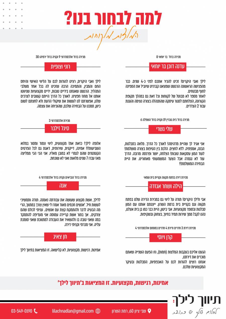 כבר מההתחלה הבנו שהבחירה בלילך ומשרדה הייתה החלטה נכונה ומוצלחת. לילך היא הרבה יותר ממתווכת, היא הפכה למדריכה אמיתית בשבילנו, כשהצגנו בפניה את הרצונות והצרכים שלנו. לילך היא מקצועית מאוד והבינה את השוק בצורה אינטימית ומעמיקה, ידע אותו רכשה לאורך עשרות שנים של ניסיון בתחום זה באיזור רמת השרון. לילך עזרה לנו לקבוע את המחיר הנכון לבית שלנו, והדגישה את היתרונות שלו בצורה מושכלת, מה שהוביל למכירה ומוצלחת.