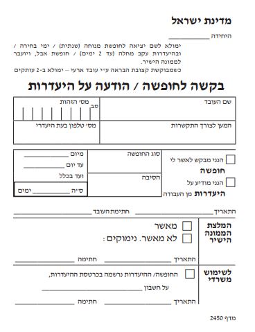 ימולא לשם יציאה לחופשת מנוחה (שנתית) / ימי בחירה /ובהיעדרות עקב מחלה (עד 2 ימים)/ חופשת אבל, ויועבר לממונה הישיר.