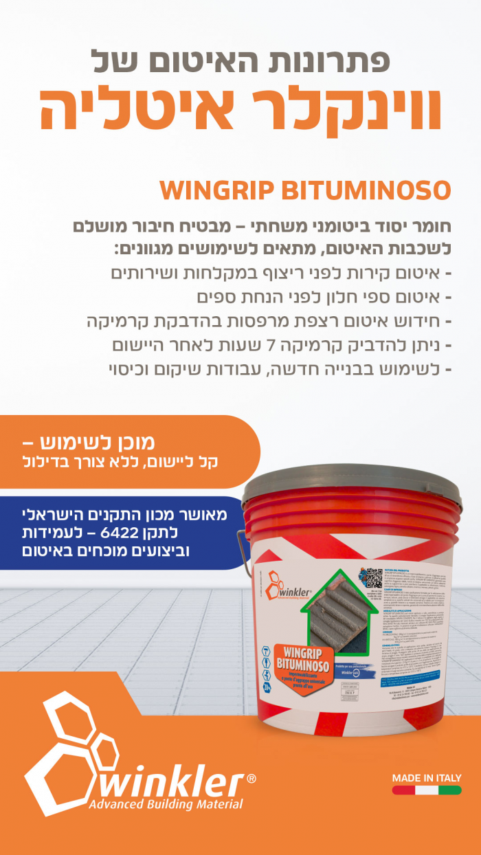 ווינגריפ ביטומינוזו- חומר איטום ללא פריימר, ביטומני על בסיס מים שניתן אחרי 7 שעות בלבד להדבק עליו קרמיקה