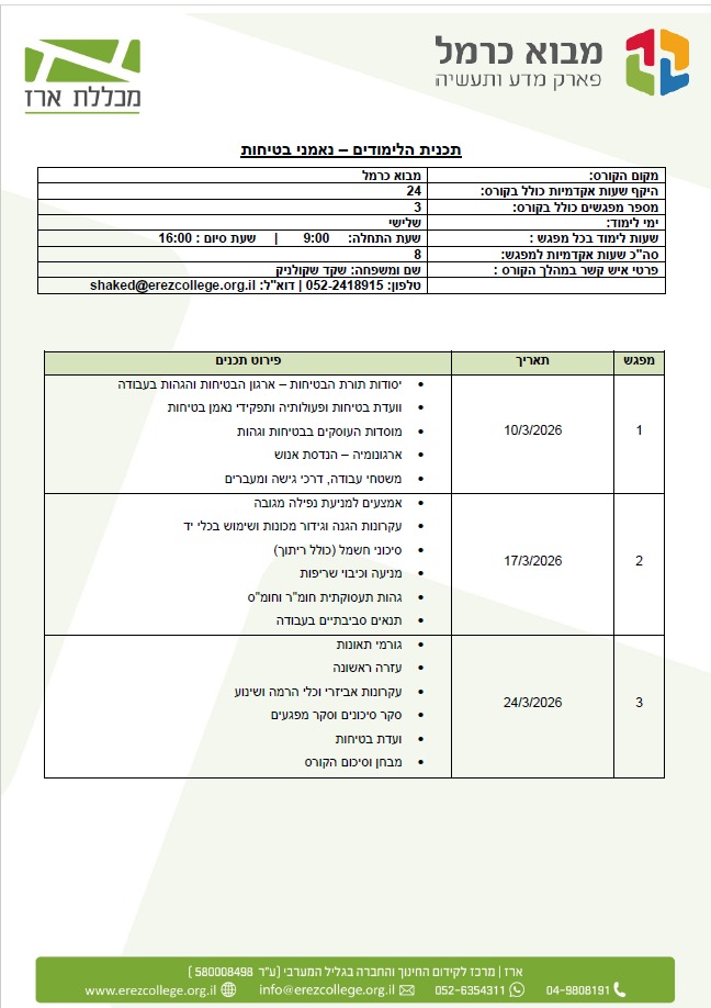 במסגרת פעילות מנהלת הפארק לקידום עסקים הפועלים בפארק, וגם בתחום הבטיחות בעסקים, במפעלים ובמרלו"גים הפועלים בפארק, אנו פותחים לראשונה כאן הכשרה לנאמני בטיחות בעסקים.