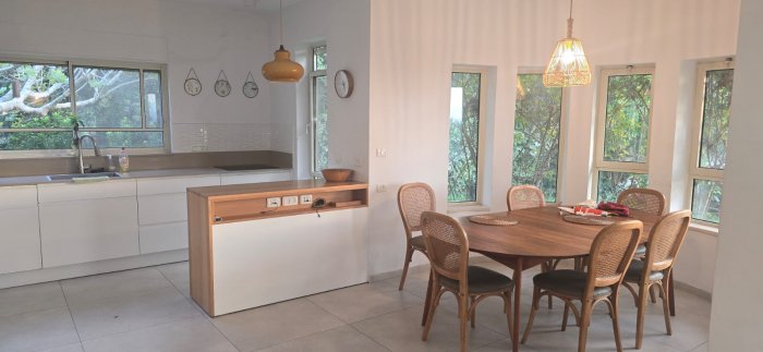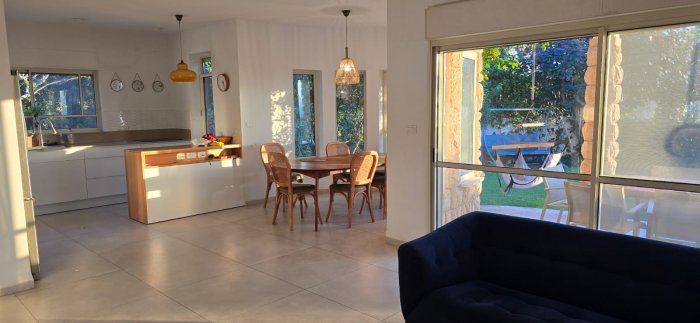 חלונות גדולים מכל כיוון מכניסים ירוק, שקט ואוויר טוב פנימה. חלל ציבורי גדול ומרווח, סלון מואר עם יציאה ישירה לפרגולה מקורה ולגינה מטופחת מושלם לאירוח, למשפחה ולרגעים של שקט. פינת אוכל מרווחת מטבח מודרני ונוח לשימוש יומיומי.
