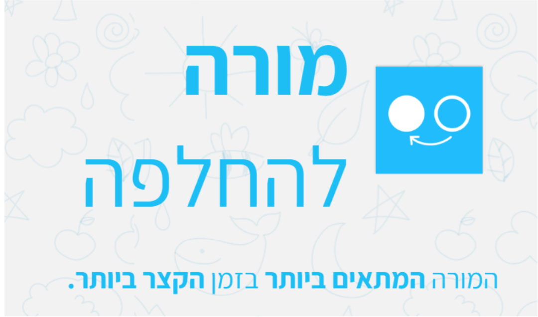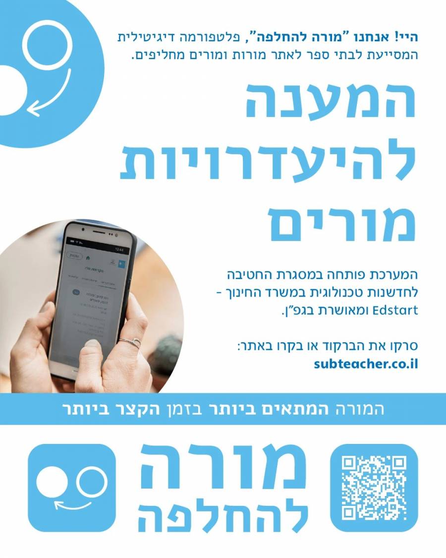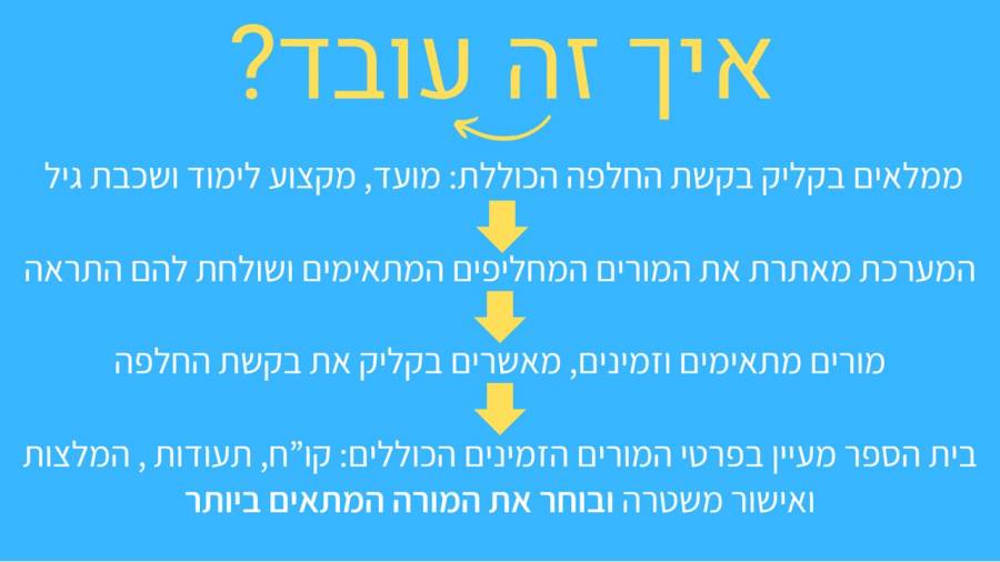 ''מורה להחלפה'' הינה פלטפורמה דיגיטלית חדשנים הכוללת מאגר גדול ואיכותי של מורים מחליפים ומקצועיים, המאפשרת לבתי הספר לאתר בזמן קצר ובתפעול ידידותי, מורים מחליפים זמינים , המתאימים לשכבת הגיל ומקצוע הלימוד ולבחור את המורה המתאים ביותר על פי מידע הקיים במערכת הכולל :