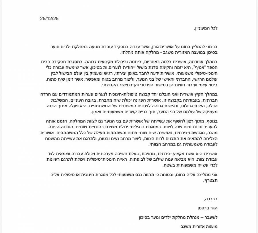 משנת 2018 ועד היום – רכזת חינוך טיפול בבית ספר על יסודי. התפקיד כולל, איתור וליווי תלמידים במצבי סיכון. ליווי צוותי חינוך והדרכת אנשי חינוך בהתמודדות עם תלמידים ומשפחות במצבי סיכון. מנחת קבוצות באמצעות כלים יצירתיים ביניהם גלישת גלים. שותפה מקצועית בצוותי חינוך וטיפול של אגף שח"ר.
