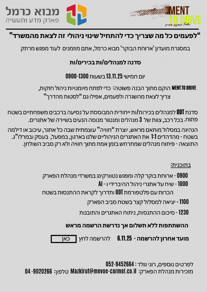 לאור הצלחת המפגש הקודם ובמסגרת שרותי העשרה של מנהלת פארק מדע ותעשייה מבוא כרמל למנהלים/ות הפועלים בפארק, מצורפת הזמנה למפגש 'מועדון ארוחת הבוקר' אצלנו במנהלת הפארק.