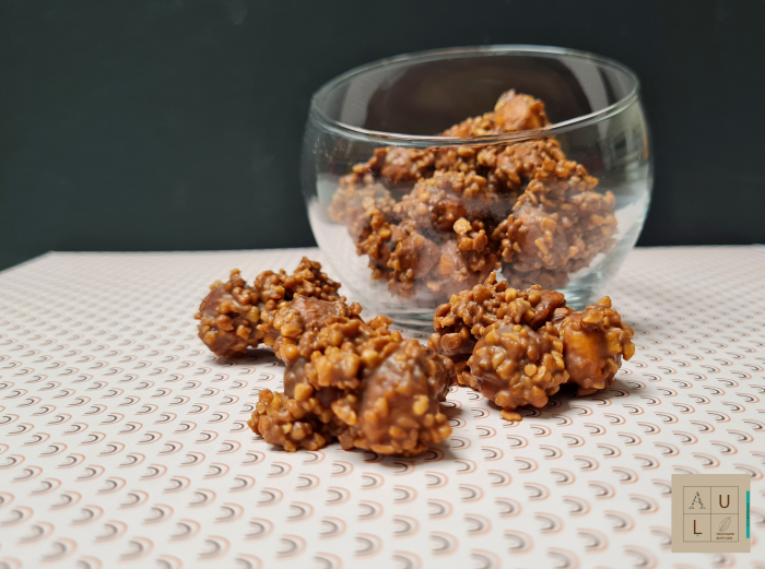 קבוצות אגוזים, גרעינים, קטניות, פירות מיובשים או כל חומר גלם טעים ומעניין ביחד או לחוד עטופים בשכבה שוקולדית מפנקת