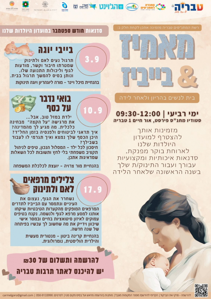 מוזמנות לפעילות חודש ספטמבר במועדון היולדות שלנו מאמיז & בייביז מבית רשת המתנ"סים טבריה: