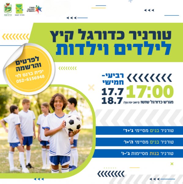 טורניר גול, טורניר הקיץ בכדורגל לילדים וילדות יתקיים בימים רביעי-חמישי 17-18.7.2024 הטורניר מיועד לבנים ובנות מסיימי כיתות אנא מלאו את השאלון ובסיום עברו לתשלום דמי הרשמה לטורניר 30 שח