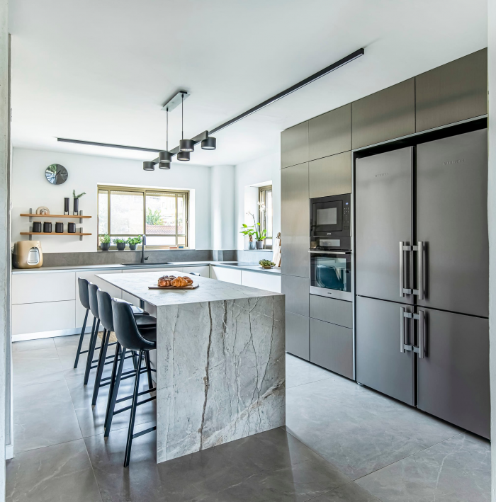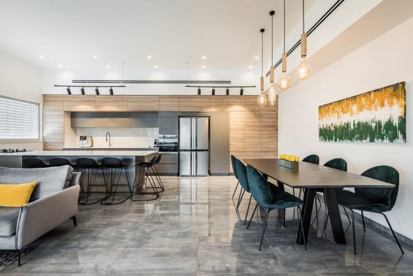 תכנון ועיצוב חלל מרכזי של הוילה, יצירת קיר "כח". כאלטרנטיבה ליצירת חיפוי בטון ועץ בקיר המרכזי- נבחר לבצע את החיפוי מקוביות קלקר בציפוי צבע דמוי בטון וטקסטורת עץ. קיבלנו מראה אותנטי של בטון ועץ, במחיר זול יותר ,יישום קל לביצוע ובחופש לעצב כפיסול בחומר.
